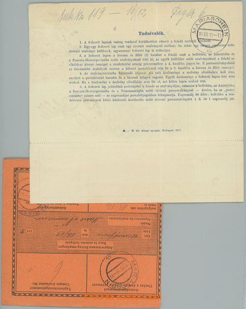 1325 imagePhilately. HUNGARY - Czechoslovakia - DEUTSCHEBOHMEN / Hungarian telegraph order sent from Szatmarnemeti (today Satu Mare in/at Romania) to Mariaschein Nord Deutsche Bohemia (!) (today Bohosudov in/at northern Bohemia), supplemented with Austrian blank form Quittance, CDS SZATMAR NEMETI 918 Dec.14. and arrival postmark MARIASCHEIN 19.XII.18; only tearing in upper margin blank form/-s, extraordinary post. document/attribut from period of formovani Czechoslovakia! (Image) (Image2) (All Images)