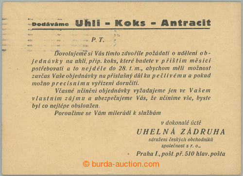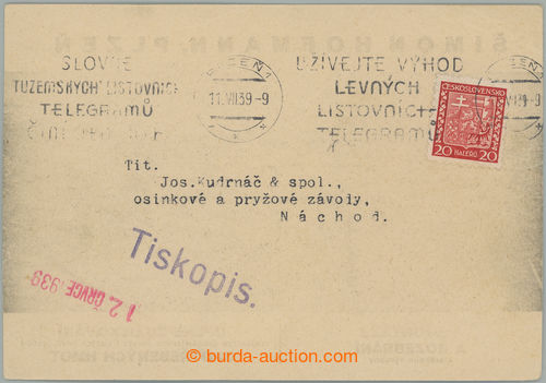 1412 imagePhilately. SRP7, forerunner machine slogan pmk - Uzivejte vyhod levnych listovnich telegramu..., PLZEn 1/ 11.VIII.39, nice print on/for advertising card f.. Simon Fofmann - Plzen, sent as Printed matter and franked with. Czechosl. forerunner stamp. Coat of arms 20h; good condition, very rare occurrence! (Image) (Image2) (All Images)