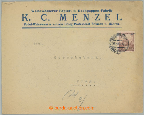 1408 imagePhilately. Mng.K20, commercial envelope with Brno 1,20 Koruna brown with perfin K.C.M f.. K.C. Menzel, CDS PODOLI U BeLE 22.XI.40; good condition (Image) (Image2) (All Images)
