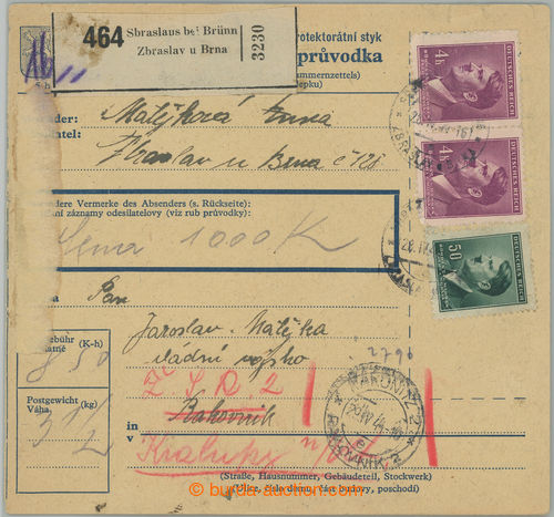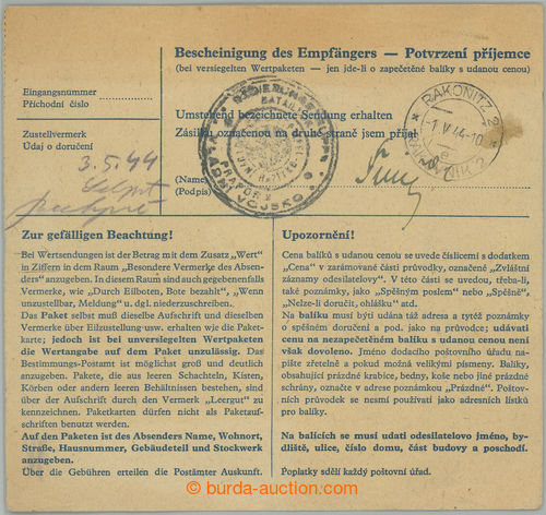1409 imagePhilately. PROTECTORATE ARMY / 2. BATTALION, larger part of parcel card sent to member of Protectorate army to Rakovnik, redirected on/for Z.S.R.2 to Kralup n./V., CDS ZBRASLAV U./B. 28.IV.44, on reverse black bicircular subdivision postmark with emblem; good condition (Image) (Image2) (All Images)