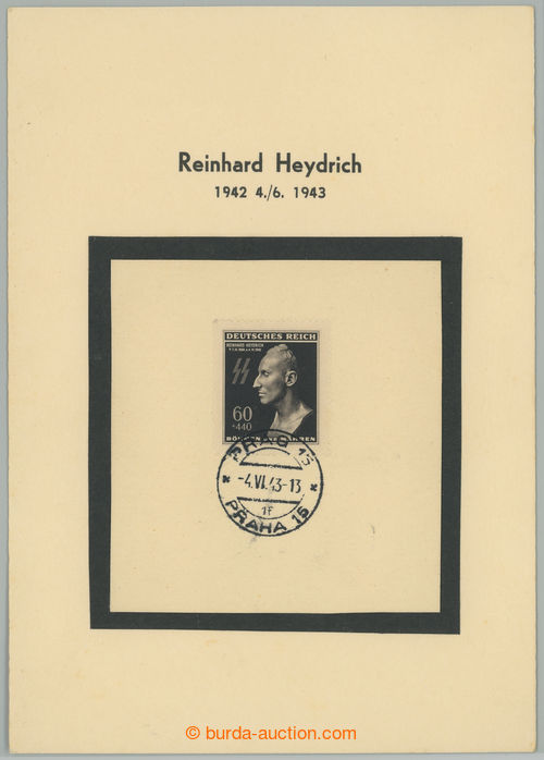 1411 imagePhilately. MEMORIAL PRINTINGS WITHOUT VLASTNIHO special postmark / 1. anniv of death R. Heydrich - first day sheet with mounted mourning stamp. Pof.111 and with black paspartou, paste-in on/for larger carton with additional-printing, CDS PRAGUE 15/ 1f/ 4.VI.43 - date vzpominkove celebration; very fine (Image) (Image2) (All Images)
