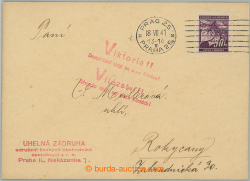 1410 imagePhilately. VIKTORIA / ctyrradkovy cachet Victoria!! / Germany wins on all fronts!, without for Europe on/for commercial card, with Linden Leaves 30h with MC PRAGUE 25/ 18.VII.41; very fine (Image) (Image2) (All Images)