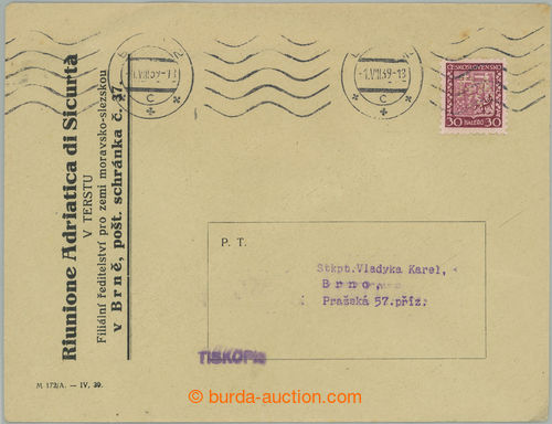 1407 imagePhilately. Mng.R9, commercial identification letter sent as Printed matter in the place, franked with. parallel Czechosl. stamp. Coat of arms 30h violet with perfin RA/S f. Riunione Adriatica di Sicurita, MC BRNO 2/ 1.VIII.39; light bend in envelope (Image) (Image2) (All Images)