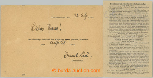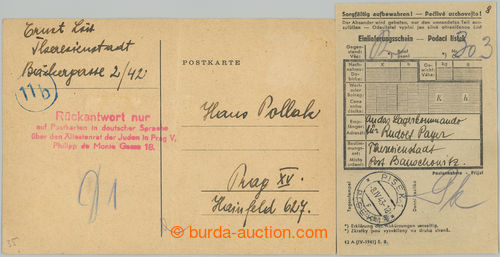 1414 imagePhilately. GHETTO TERESIENSTADT - PROTECTORATE / PC from ghetto - thanks for parcel addressed to to Prague, transported courier SS on/for Council of Jewish Elders, red four-line off. cancel. Ruckantwort nur/ auf Postkarten..../ Philip de Monte Gasse 18., according to text 13.Aug.44 + certificate of mailing for Reg letter sent to Lagerkommando, CDS PISEK 1/ 8.IV.43; good condition (Image) (Image2) (All Images)