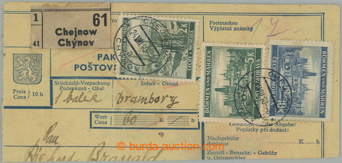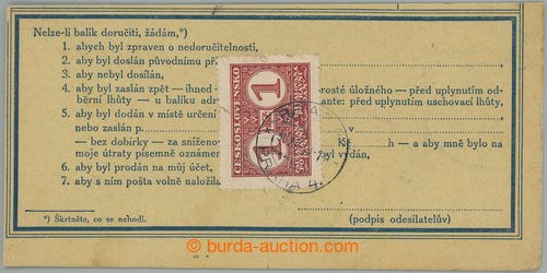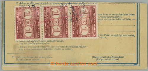 1405 imagePhilately. parcel dispatch card segment on parcel brambor, fee after/behind transport food was/were paid vertical str-of-3 (!) stamp. 1 Koruna, Pof.PD1 with CDS PRAGUE 35/ 26.VIII.40; in/at cut hints moisture, stamp. without defects, rare multiple franking stamps food tax! (Image) (Image2) (All Images)