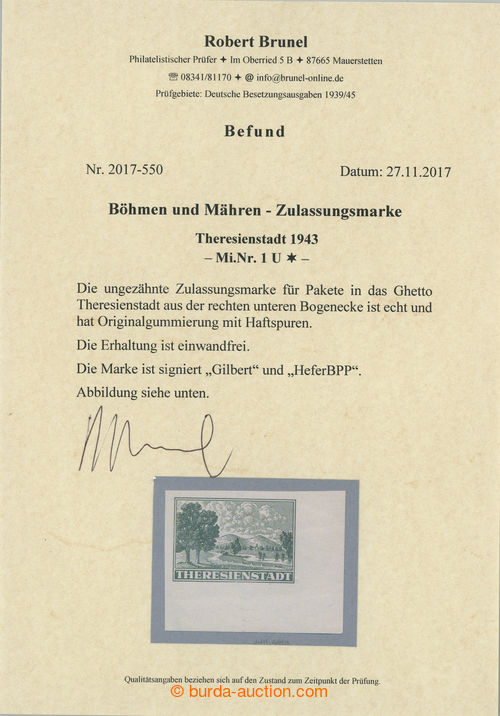 1403 og imagePhilately. Pof.Pr1B, Admission stmp, imperforated, LR corner piece (!); hinged, certificate Brunel, exp. Hefer (Image) (Image2) (Image3) (All Images)