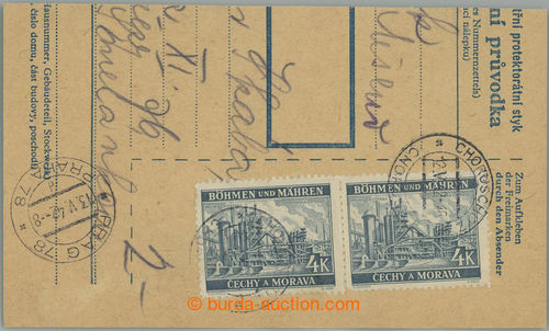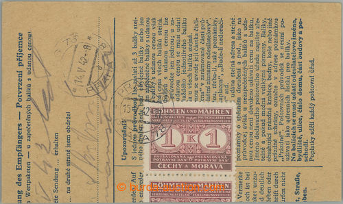 1406 imagePhilately. parcel dispatch card segment on/for potraviny, where fee after/behind their/its transport was/were paid pair stamp. 1 Koruna, Pof.1 (1 stamp. cut), CDS PRAGUE 78/ 15.V.42; slightly faded, overall but good condition and sought (Image) (Image2) (All Images)