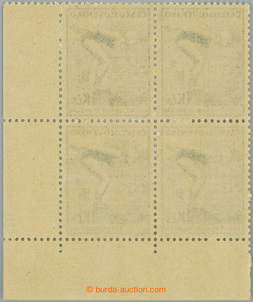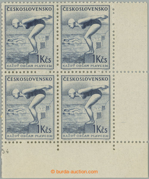 Philately. Pof.790, Physical training 1CZK blue, LR corner blk-of-4 with plate variety - line through C in/at name state pos. 39/1; mint never hinged, sought defect! (Image) (Image2)