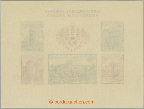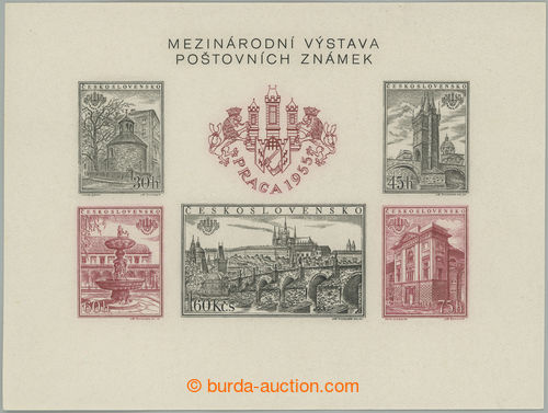 Philately. Pof.A853/857B plate variety, miniature sheet PRAGA 1955 imperforated, sought combination A4-E2, in addition with plate variety A; mint never hinged, only small production gum flaw (Image) (Image2)