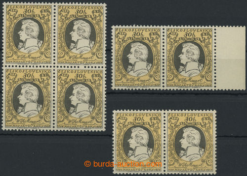 Philately. Pof.887, Prague Spring 30h, block of four from reprint (lighter yellow, darker black, significantly stronger print ornamentu and inscription W. A. Mozart) with shift yellow up (yellow limec), also with marginal Pr also