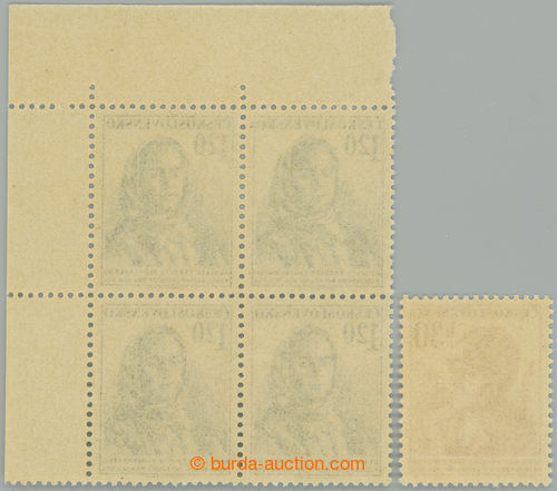 Philately. Pof.796 + 797, Anniv Slovak National Uprising 30h + 1,20Kcs, stamp. values 30h with plate variety - vertical line in/at cap 28/1 + value 1,20Kcs corner blk-of-4 with plate variety - line through LO 19/1; mint never