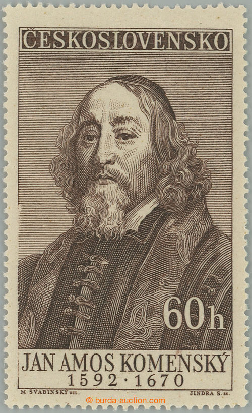 Philately. Pof.930 production flaw, 60h Comenius, V. type, significant incomplete-printing marginal frame on/for L side; interesting