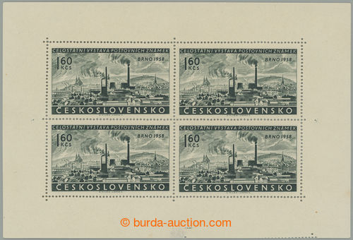 Philately. Pof.PL1017 production flaw, Exhibition Brno 1958 1,60Kcs, complete counter sheet, in lower margin partial stroke perf frame in addition; mint never hinged, thin place in lower margin, small spot, after all interesting! (Image) (Image2)