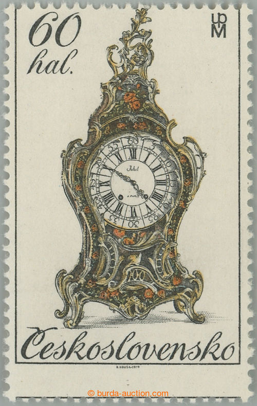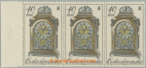 Philately. Pof.2400 RE, Historical Clocks 40h, str-of-3 with date 20.VIII.79 (last day print), with retouch defects on/for 2/7, place black little lines group thin/light dots (retouch only this day, will be zarazeno in catalogue),