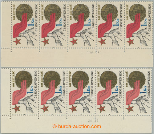 Philately. Pof.2486, 60. Anniv Communist Party of Czechoslovakia 1Kcs bricky red, type I - L corner vertical strip of 5 with date of print 2.III.81 + also with common L vertical corner str-of-5 with stamp. II. type and date of