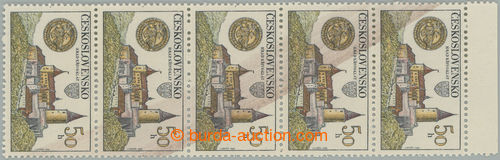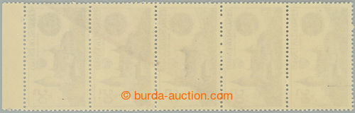 Philately. Pof.2545 production flaw, Krivoklat 50h, vertical upper marginal strip-of-5, on all stamps significant wide oblique smudge brown printing color; interesting and very decorative (Image) (Image2)