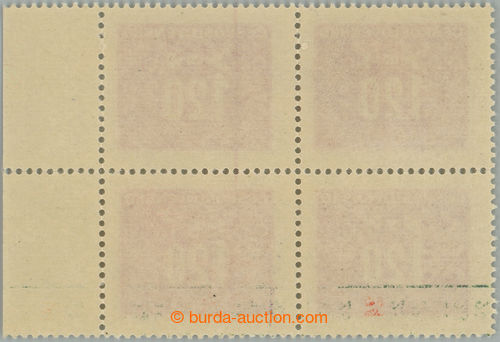 Philately. Pof.D71 production flaw, Hlubotiskove issue 1,20Kcs red, R marginal blk-of-4, on 2 stamp. significant vertical stain printing color; mint never hinged, defects gum of storage, povolena horiz. perf, after all interesting