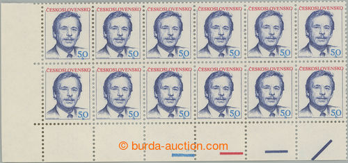 Philately. Pof.2928 production flaw, Havel 50h with shift blue color downward (frame puli zkratku h in face value) and red color downward transport (Havlovy hair zasahuji to name state), L the bottom corner blk-of-12 with KBZ (3.
