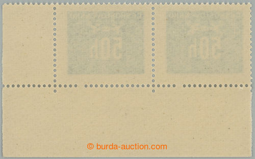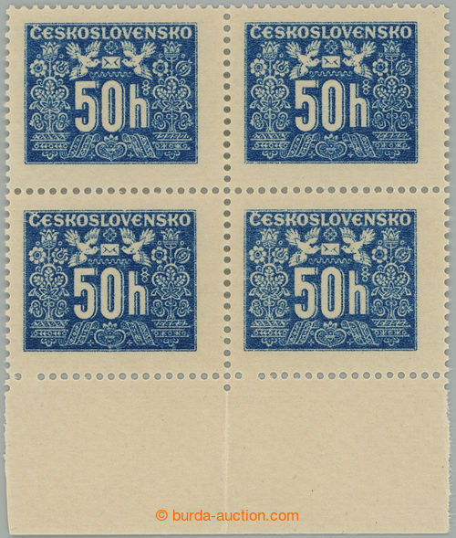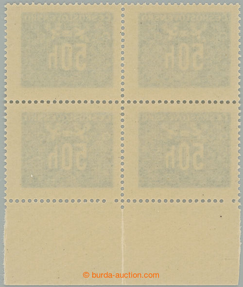 Philately. Pof.D69 production flaw, Hlubotiskove issue 50h, block of four with lower margin, 2x omitted perf hole 3. from the L; in perforation vert. fold, mint never hinged, c.v.. -.- (Image) (Image2)