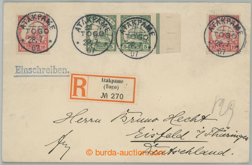 Philately. Reg letter sent from Atakpame to Germany with issue 1900 5Pf and 10Pf, Mi.8 marginal Pr and Mi.9 2x, CDS ATAKPAME TOGO 28.7.07, on reverse arrival postmark EISFELD 30.8.07; good condition (Image) (Image2)