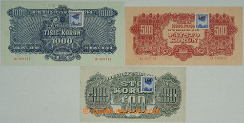 Banknotes. Ba.66-68, complete set 3 pcs of stamped Moskevskych orders, values 100 Koruna - 1000 Koruna, set OB, AT, CK, value 100 Koruna variant TATO, all perf 1x SPECIMEN at top; very nice (Image) (Image2)
