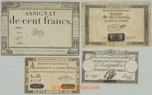 Banknotes. FRANCE / comp. of 4 assignatu: 5 livres 1.11. 1791 (Pi.A50) + 25 sols 4.1. 1792 (Pi.A55) + 10 livres 24.10. 1792 (Pi.A66) + 100 francs 18 nivose l´an III (7.1. 1795) (Pi.A78); nice obehove zachovalosti (Image) (Image2)