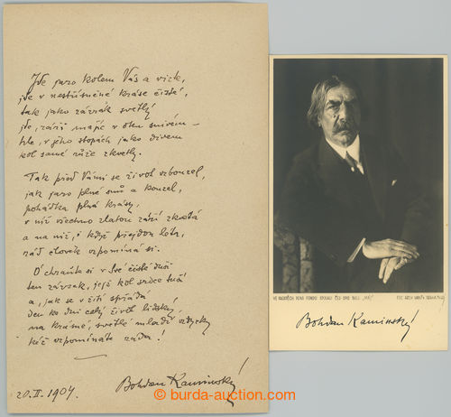 Autographs. KAMINSKY Bohdan (one's own name Charles Busek, 1859-1929), Czech poet, translator, handwritten written poem with full signature and dataci on card + B/W portrait photopostcard with printed signature; interesting (Image) (Image2)