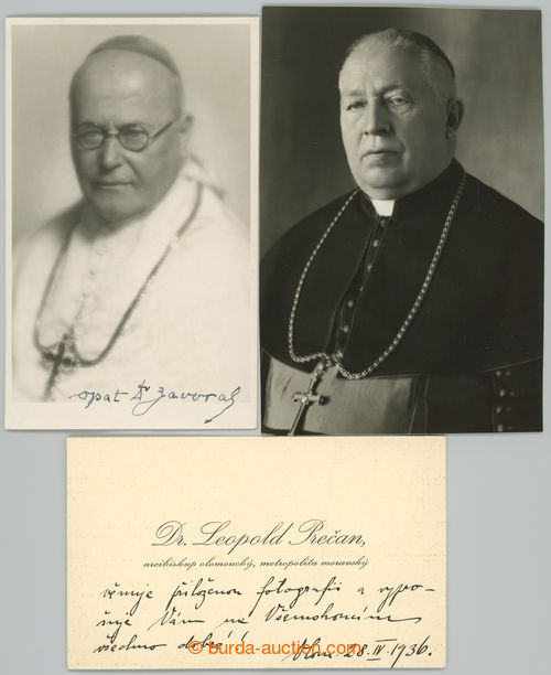 Autographs. PRECAN Leopold (1866-1947), Olomouc archbishop + ZAVORAL Method John (1862-1942), opat premonstratskeho monastery in Prague on/for Strahove, member of parliament and senator; visiting card with pripisem and signature,