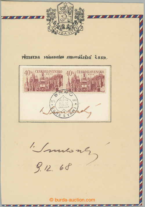 Autographs. SMRKOVSKY Joseph (1911-1974), Czech politician, representative reformniho proudu in/at Communist Party of Czechoslovakia, 2x autograph on memorial sheet; rare usage (Image) (Image2)