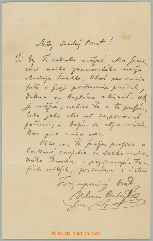 Autographs. PAULINY-TOTH Viliam (1826-1877), Slovak politician, spisovatel-beletrista, poet, publicist and translator, important representative group/-s sturovcu, handwritten jednostrankovy text with signature, rarely occurring