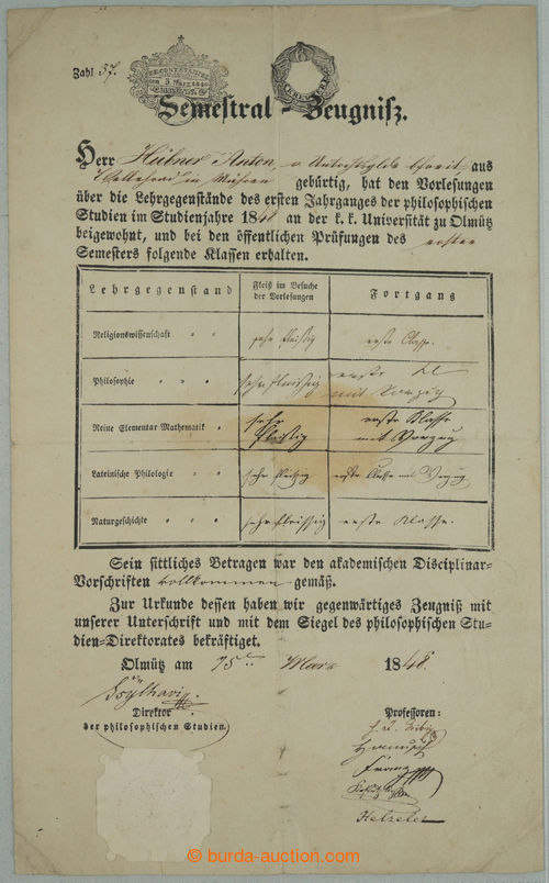 in/at Nove Empire, handwritten text with signature on/for certificate Olomouc university, attached spolupodpisy (i.a. J. E. Helcelet, 1812-1876, Brno doctor, vysokoskolsky Professor, national buditel, politician); well preserved, rare (Image) (Image2)