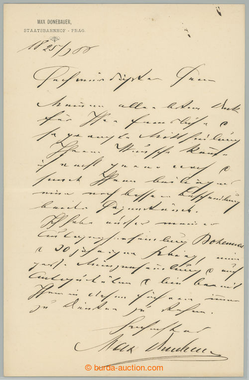 Autographs. DONEBAUER Max (1838-1888) Czech-German restaurater at railway-station in Pardubice, later in Prague, pioneer Czech numismatiky, creator of exceptional, still reference collection Czech razeb, also important collector
