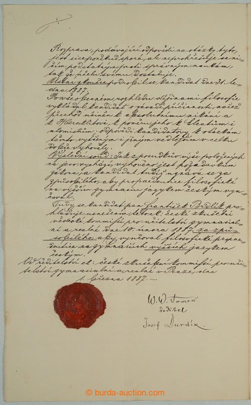 Autographs. TOMEK Wenceslas Vladivoj knight (1818-1905), Czech historian, archivar, politician, rektor Univerzity Charle's + DURDIK Joseph (1837-1902), Czech philosopher, psycholog, estetik, translator, literary critic; signatures