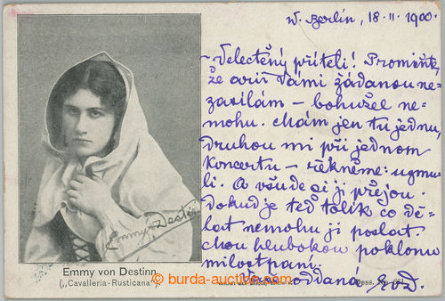 Autographs. DESTINNOVA Emma (1878-1930) (Emilie Kittlova), svetoznama Czech opera singer, handwritten text on/for portrait photo postcard sent from Berlin; good condition and sought (Image) (Image2)