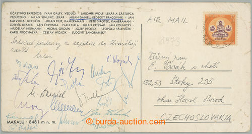 Autographs. CZECHOSL. HOROLEZECKA EXPEDICE HIMALAJ 1973 / tematicka postcard sent from Nepal to Czechoslovakia, handwritten signed all participants expedition, which/what usilovali about/by zdolani osmitisicovky Makalu, i.a. also