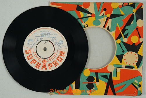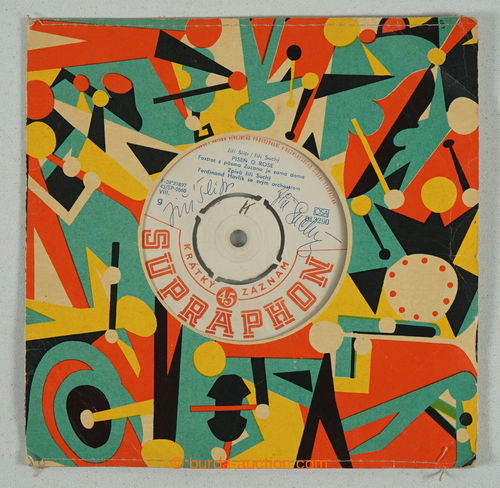 Autographs. SLITR George (1924-1969) + SUCHY George (*1931), Czech musical skladatele, instrumentaliste, singers, actors, zakladatele theatre Semafor, handwritten signatures on/for etikete gramofonove folder Pisen about/by rose /