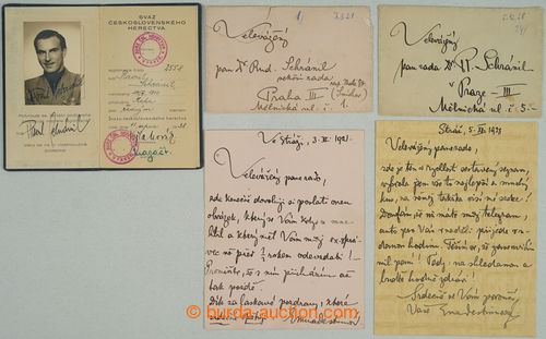 Autographs. SCHRANIL Raul (1910-1998), slavny Czech actor, whole signature on own legitimaci Union Czechoslovak herectva from year 1938, supplemented with about/by two handwritten written letters; as multiple interesting (Image)