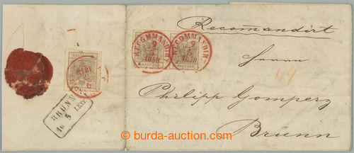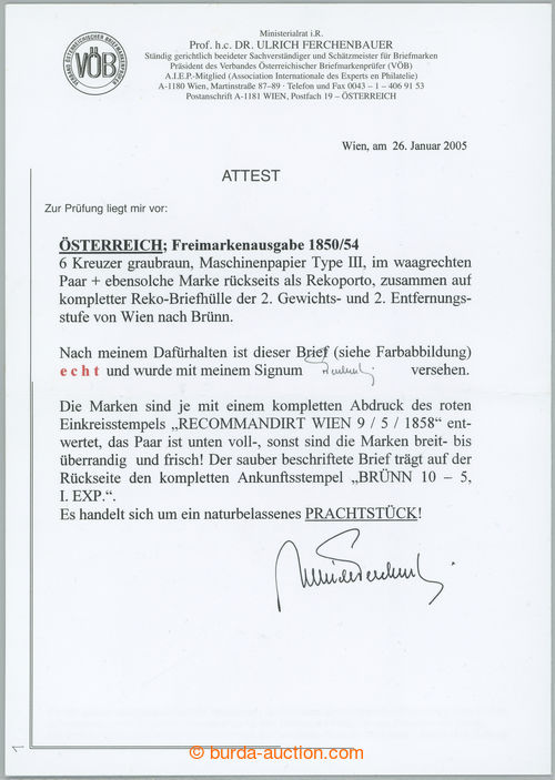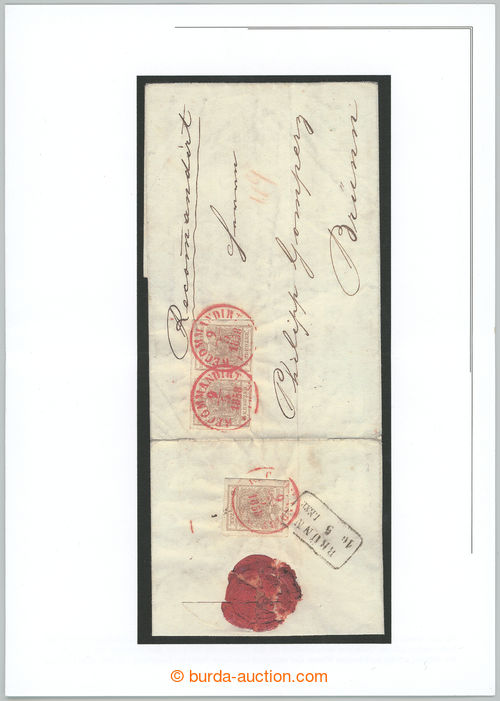 Philately. Reg letter with 3x Coat of arms 6 Kreuzer type III on machine paper, one 6 Kreuzer as reccomendation charge, with red cancel. WIEN RECOMMANDIRT 9/5 1858; certificate Ferchenbauer - Prachtstuck, c.v.. 6.000EUR (Image) (Image2)