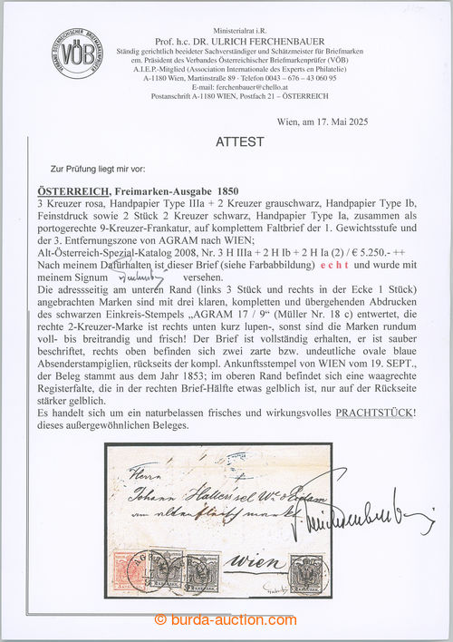 Philately. letter from Zagreb (Agram) to Vienna with two-colour multiple franking 2+2+2+3Kr, 3 Kreuzer type III , 2 Kreuzer I. types, very fine with certificate Ferchenbauer. wirkungsvolles PRACHTSTUCK, c.v.. 5.250EUR for machine