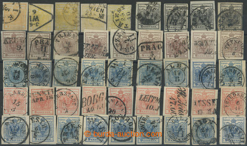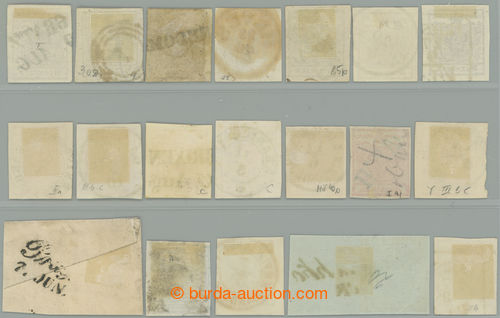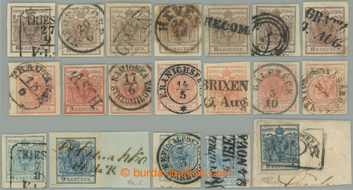 Philately. SELECTION of / Coat of arms 3Kr-9Kr, 19 pcs, all with better postmarks, chosen quality, i.a. REGISTERED, frame postmaster official GRAN, pre-philatelic ASCG, 2x TRIESTE V.L.A., DOBRUSCHKA, KAMIONKA, dumb 1 (WIEN), HEVES,