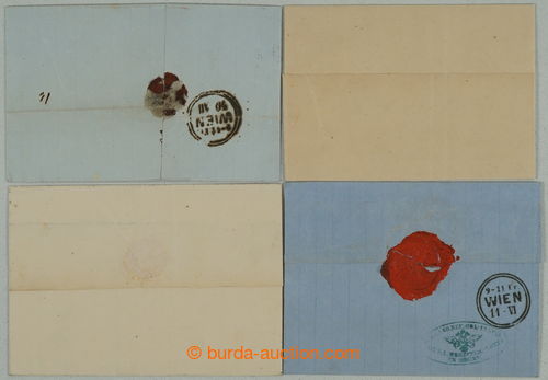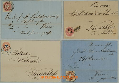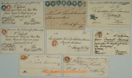 Philately. SELECTION of / 11 letters and cut-square with various frankings I., III. and The 4th issues, i.a. Reg letter franked with I. issue from Bratislava with cancel. RECOMMANDIRT PRESSBURG, then for example. TROPPAU, PLUMENAU,