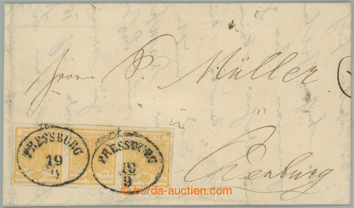 Philately. letter to Sopron, franked with horiz. str-of-3 Coat of arms 1 Kr yellow / orange, hand-made paper, type Ia, Ferch.1HP Ia, cancel. PRESSBURG 19/9; very fine, c.v.. 2.500EUR, rare letter, ex Vorisek (Image) (Image2)