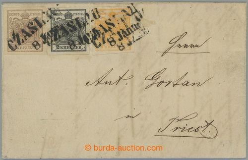 Philately. letter to Trieste, franked with tricolor franking of 1Kr+2Kr+6Kr, Ferch.1, 2, 3, all III. types, CDS CZASLAU 8 JANN.; very fine quality, certificate Kopriva, c.v.. 4.500EUR, rare, ex Vorisek (Image) (Image2)