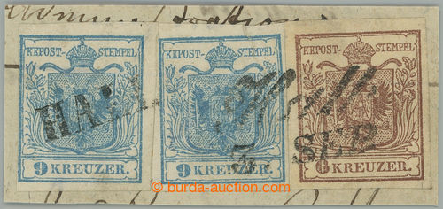 Philately. small cut square with Ferch.4HPIa + 5IHP, Coat of arms 6 Kreuzer + 2x 9 Kreuzer, I. types, hand-made paper, 2x cancel. HALL; very fine, cat. only 6+9+9Kr 360EUR, here with rarer combination of postmarks (Image) (Image2)