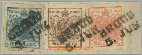 Philately. small cut square with Ferch.3+4III+5II, Coat of arms 3 Kreuzer + 6 Kreuzer + 9 Kreuzer, cancel. BROOD 5.JUN.; minor faults, c.v.. 1.000EUR, nice franking (Image) (Image2)