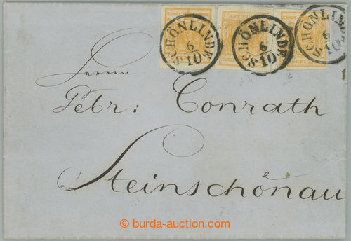 Philately. letter to Kamenicky Senov, franked with 3 stamps Coat of arms 1 Kr yellow / orange, Ferch.1Ib, cancel. SCHONLINDE 6/10 (Krasna Lipa ); very fine, certificate Kopriva, c.v.. 2.300EUR, very nice letter, ex Vorisek (Image) (Image2)