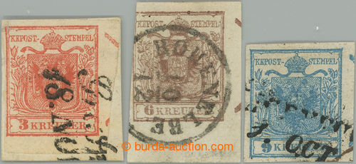Philately. ST. ADREWS CROSS / Coat of arms 3 Kreuzer (on small cut-square), 6 Kreuzer (corner) and 9 Kreuzer, Ferch.2I, 4III, 5HPI, all with parts of St. Andrew's crosses at right, 6 Kreuzer and 9 Kreuzer 1mm, 3 Kreuzer at top 3mm;