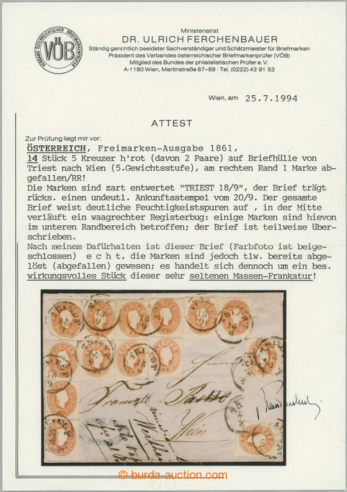 Philately. 5x heavier letter (75Kr porto) from Trieste to Vienna, franked with 14x Coat of arms 5 Kreuzer Franz Joseph I. The 3rd issue., one stamp missing; overall fine and very rare franking, certificate Ferchenbauer RR! - min.