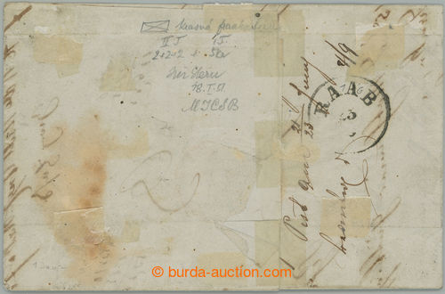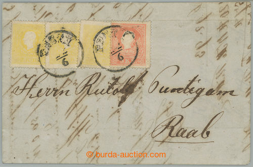 Philately. letter to Raab, franked with 3 stamps Franz Joseph I. 2 Kreuzer II. types + 1x 5 Kreuzer type I., CDS PEST, on reverse arrival RAAB; overfranked, however rare letter, c.v.. ca. 2.000EUR, ex Vorisek (Image) (Image2)