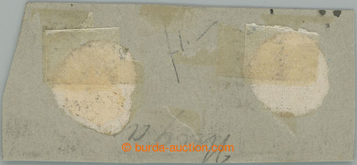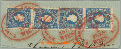 Philately. Ferch.15I, Franz Joseph I. 15 Kreuzer blue, 2x vertical pair of I. types on small cut-square with RED oval cancel. WIEN 19/1/1859; very fine, c.v.. 640EUR++, ex Vozab and Vorisek (Image) (Image2)